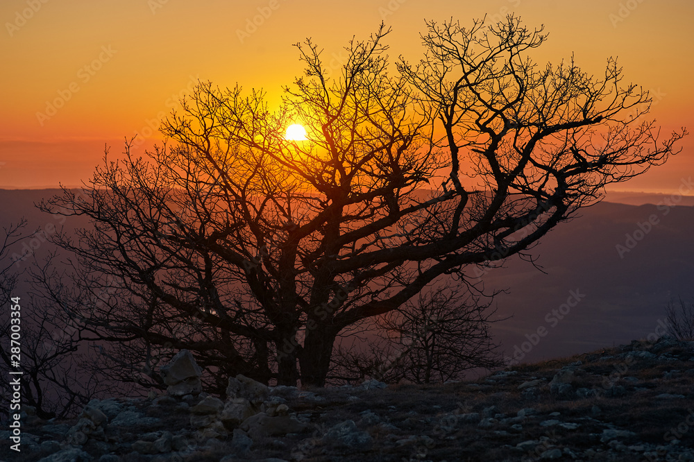 silhouette of branchy tree in sunset lights. mountain sunset landscape with tree in dusk. orange and yellow sunset or sunrise sky