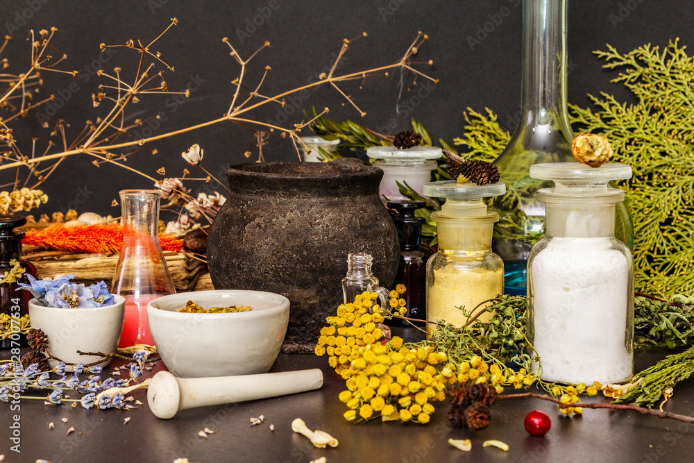 Halloween concept. Alchemy laboratory of the witch