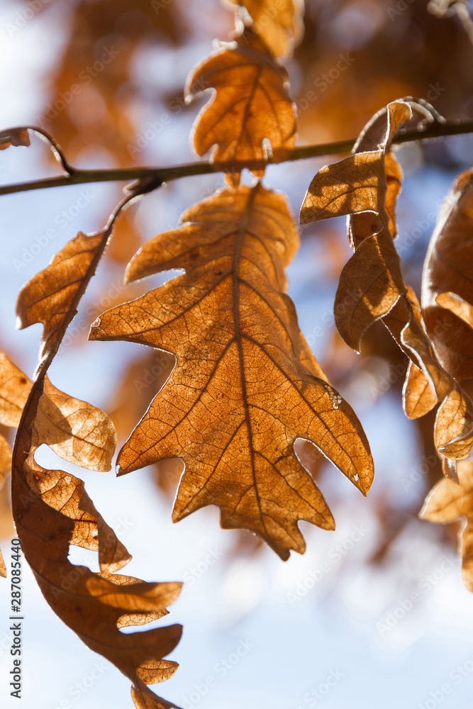 Detail of lobed leaf of white oak , brown in the winter and sky background