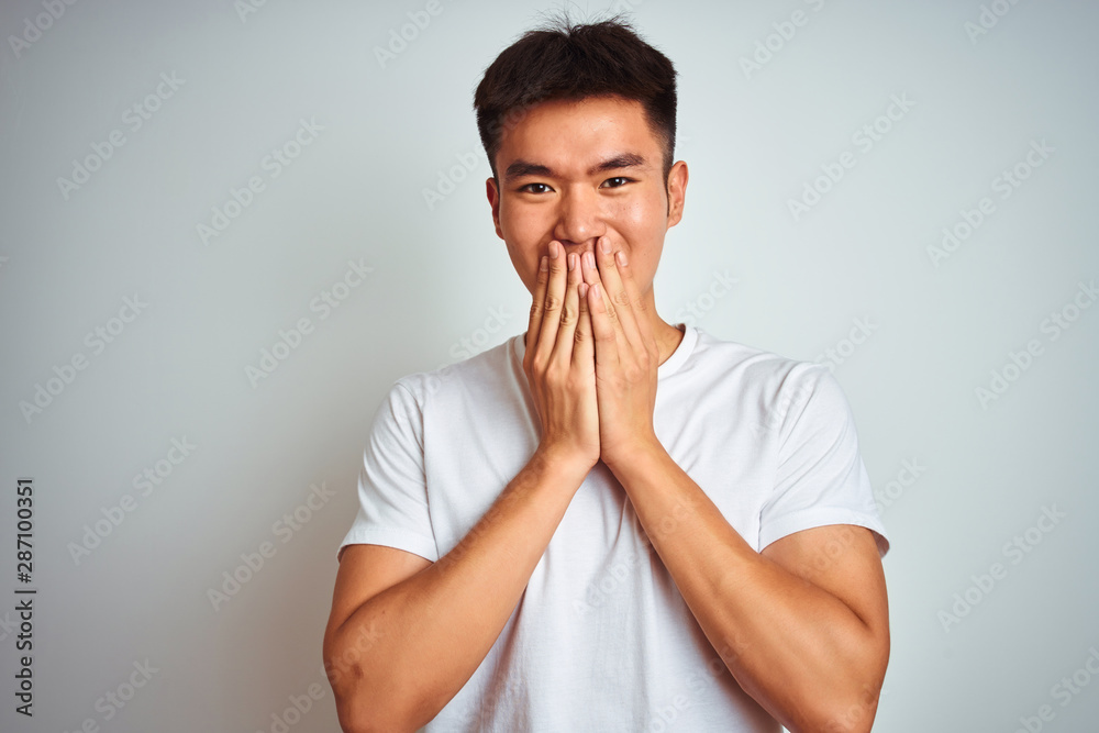 Young asian chinese man wearing t-shirt standing over isolated white background laughing and embarrassed giggle covering mouth with hands, gossip and scandal concept