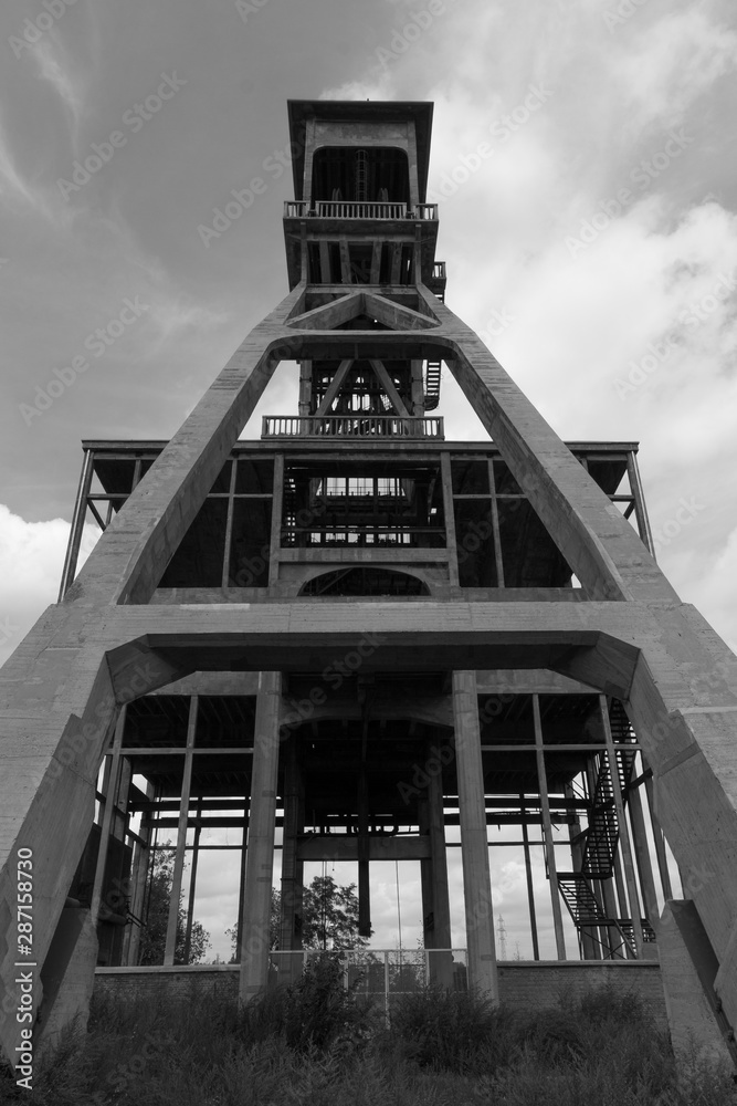 A dramatic sky with former elevator shaft for the coal mines in Maasmechelen, Belgium nowadays converted area and being part of a free public park