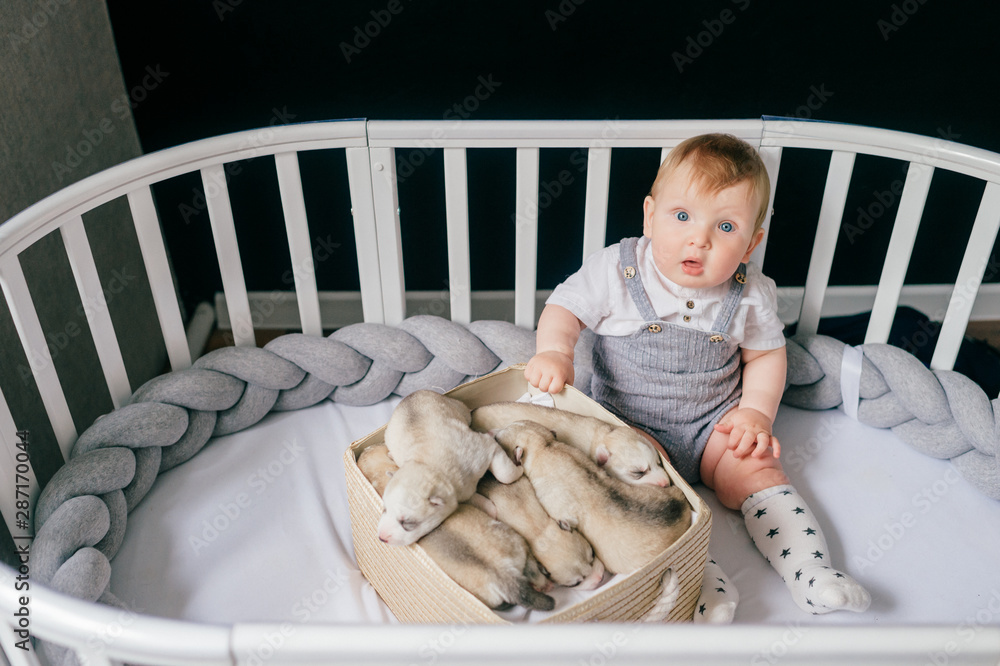 Little child siiting in crib with newborn husky puppies
