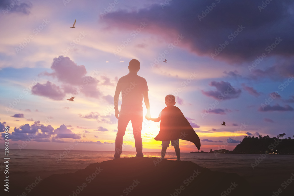 Super Son holding hand of fatheroutdoors on background sunset. Father holiday