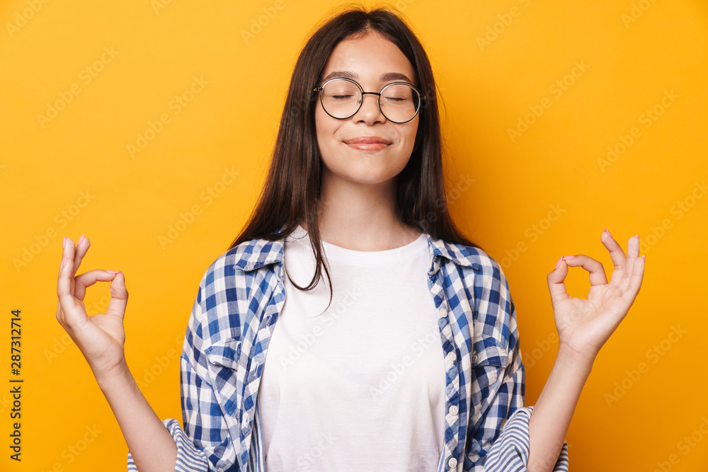 Pleased optimistic young cute teenage girl in glasses meditate isolated over yellow wall background.