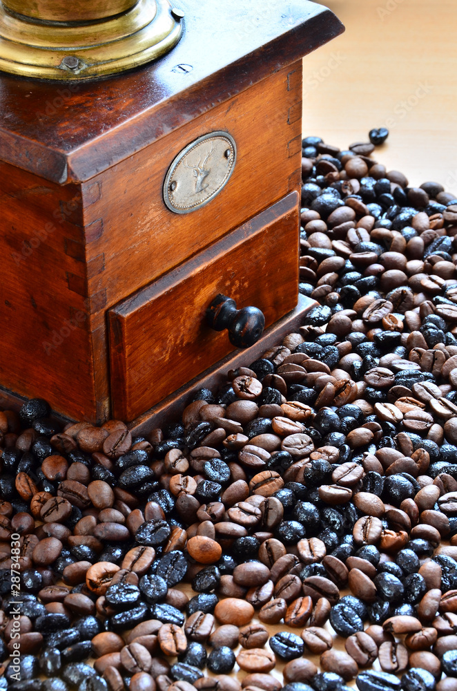 Vintage coffee grinder and blend of coffee beans