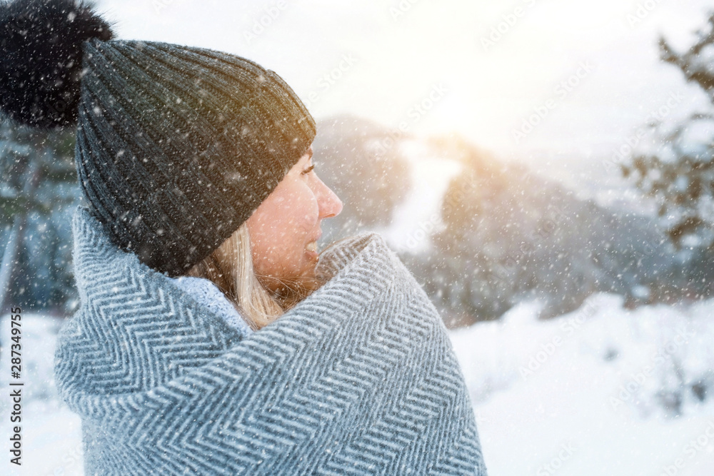 Portrait Happy woman traveler on the snowy of mountain look on t