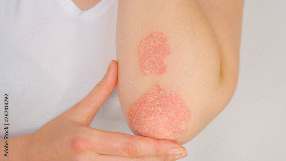 CLOSE UP Woman with big red scaly rash suffering from elbow psoriatic arthritis