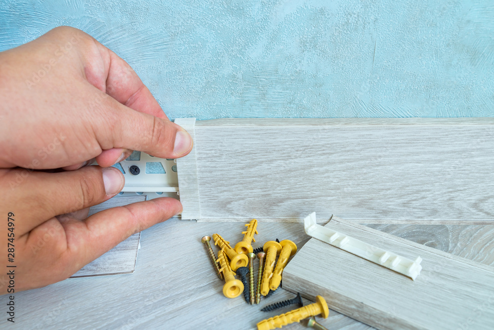 Worker's hands Instal plastic skirting board on laminate flooring. Renovation of baseboard at home.