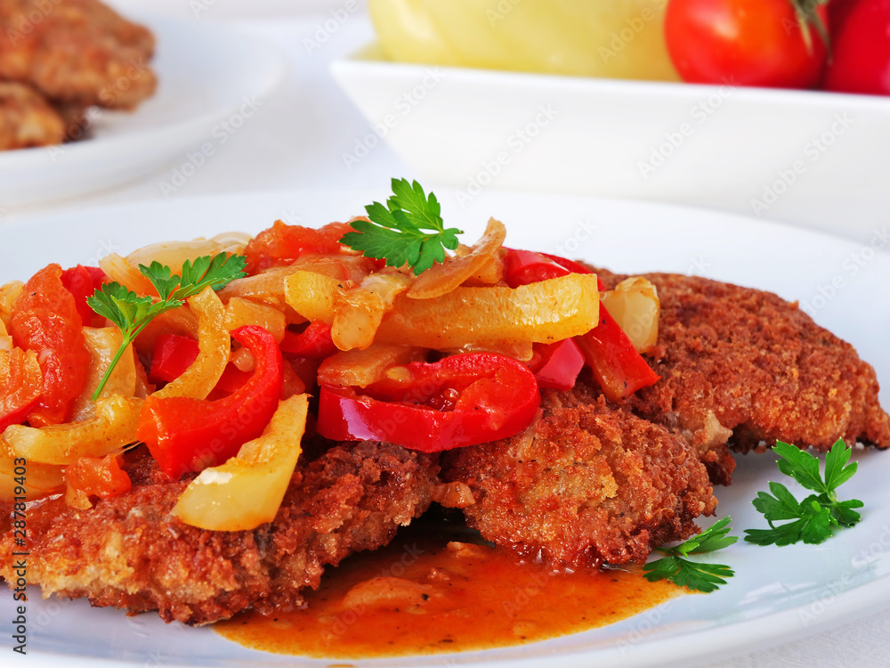 Homemade breaded schnitzel served with lecho. Crispy breadcrumb coated fried meat served with vegetable stew.