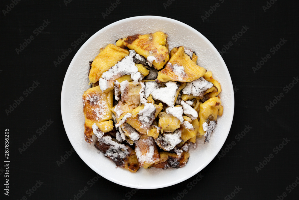 Homemade german Kaiserschmarrn pancake with apple sauce on a black background, top view. Flat lay, overhead, from above. Close-up.