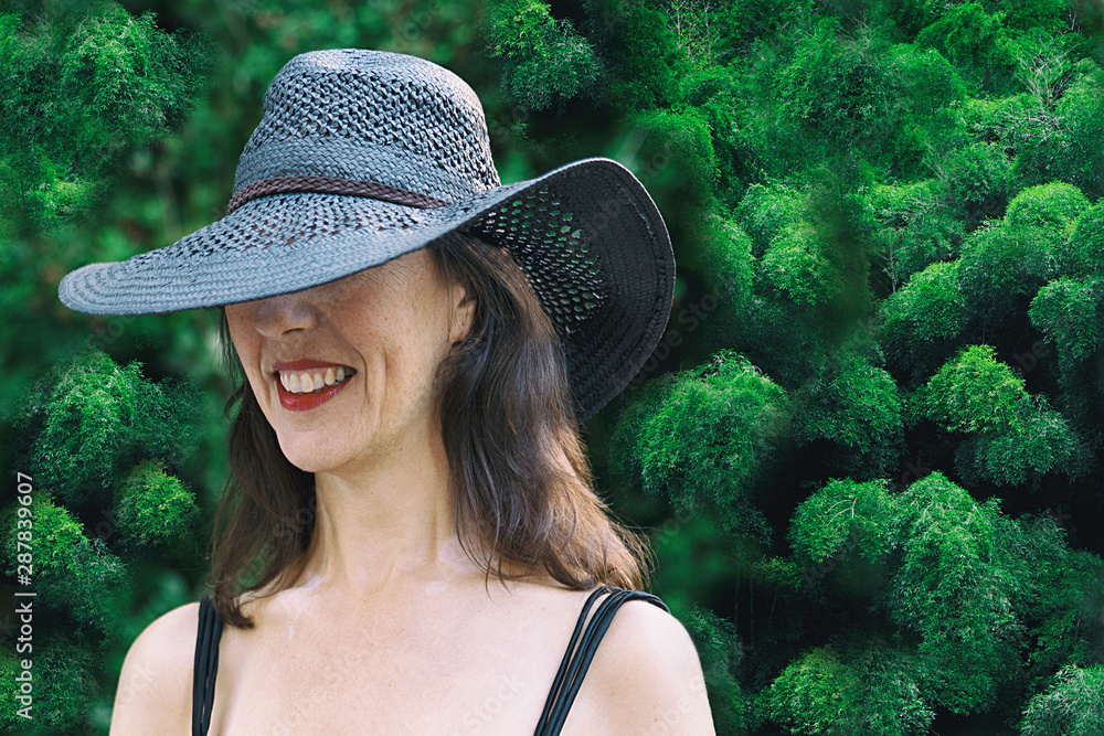 woman with black pamela smiling in front of a bamboos garden II , spain