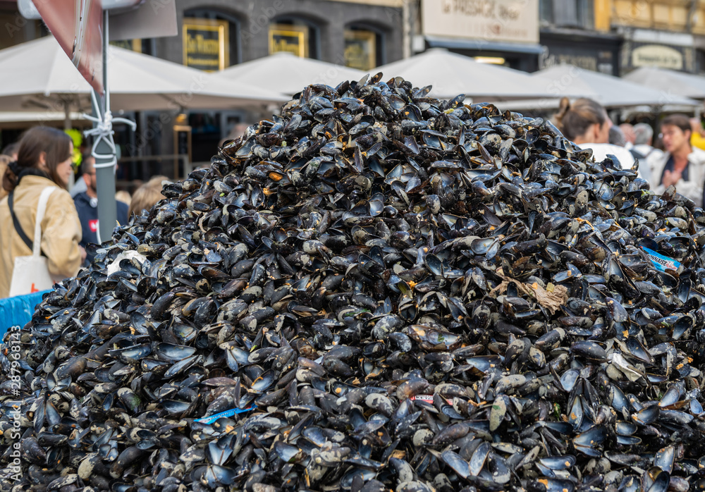 Great Lille Braderie (Braderie de Lille).Large pile of shells from eaten mussels, traditionally built on Great Lille Braderie.