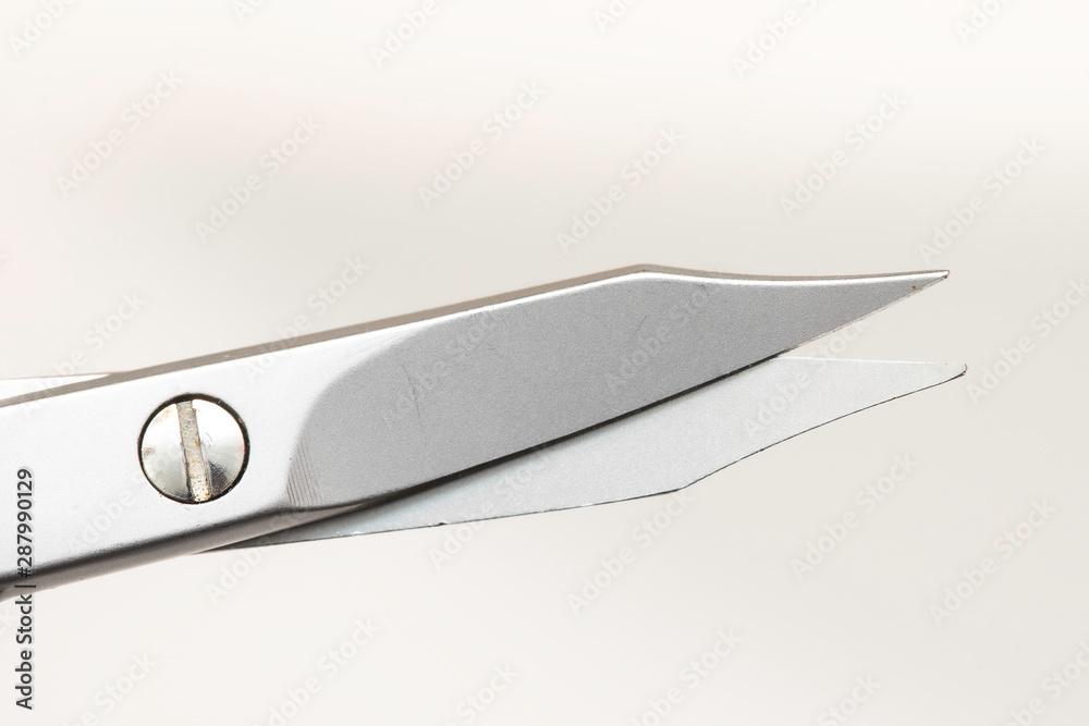 A macro and extremely detailed view of stainless steel nail scissors, used to trim fingernails and toenails, isolated against a white background.