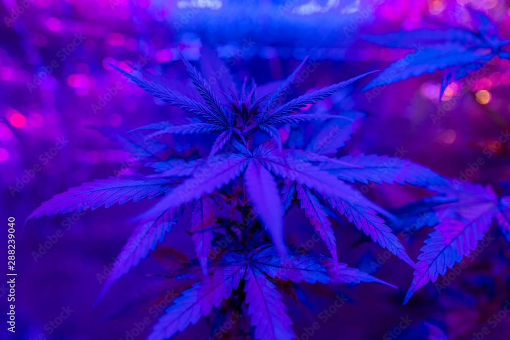 marijuana plant creative blue background in a grow box or greenhouse on a farm