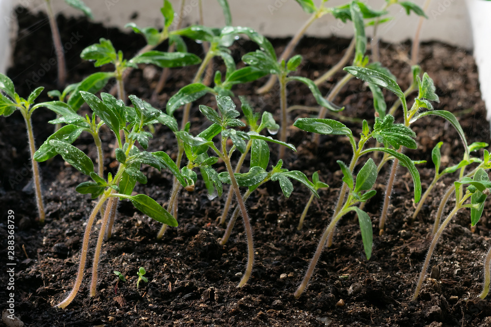 Young green tomato seedlings in white box with little drops of water on leaves, increasing harvest