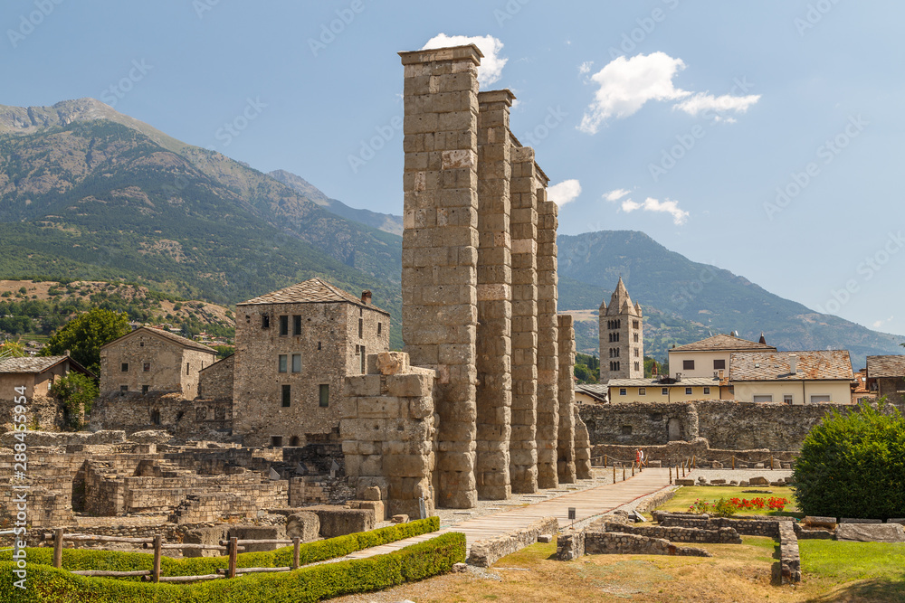 Ruins of the ancient Roman town Augusta Praetoria Salassorum in Aosta, Italy