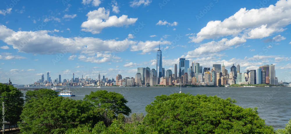 New York, NY, USA. Amazing skyline of Manhattan skyscrapers and buildings from Ellis Island. Landscape inclusive of the Freedom tower - One World Trade Center