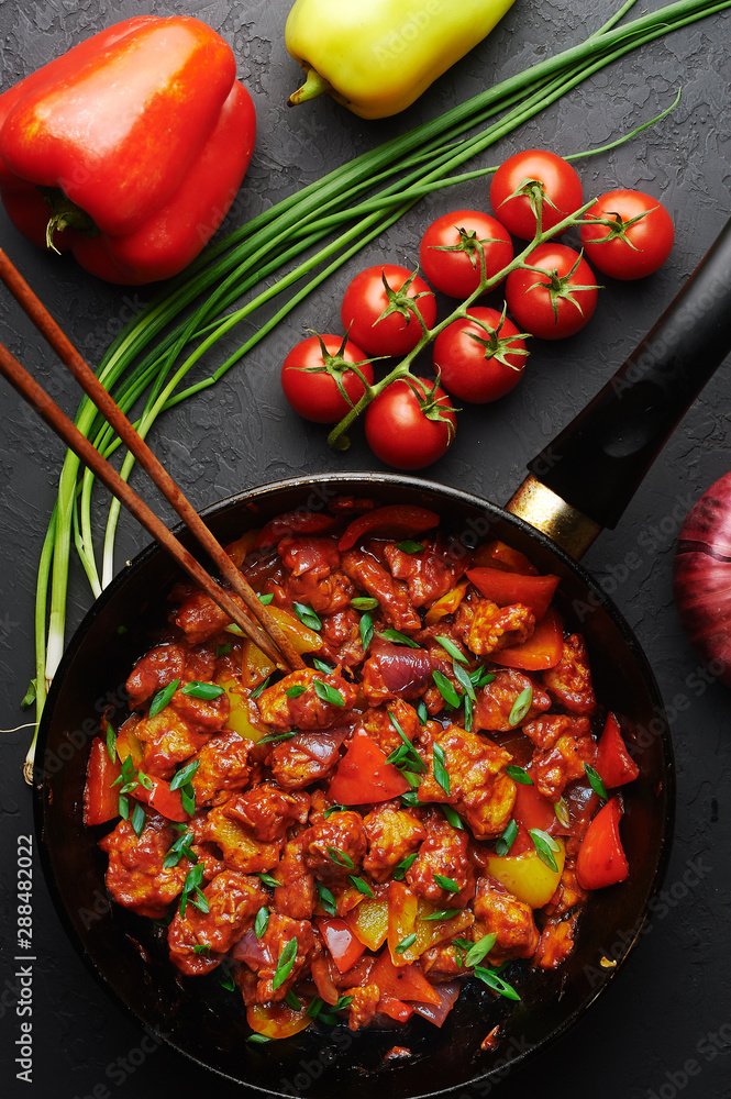 Chicken Manchurian in pan at black concrete background. Chicken Manchurian is Indian Chinese cuisine dish with Chicken breasts, bell pepper, tomatoes, soy sauce.