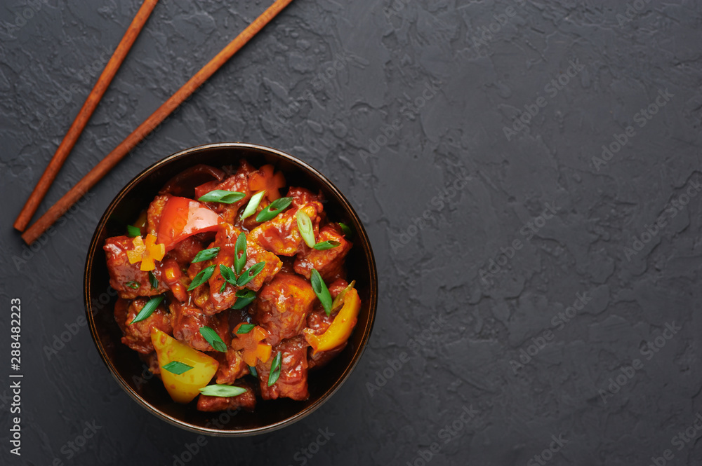 Chicken Manchurian in bowl at black concrete background. Chicken Manchurian is Indian Chinese cuisine dish with Chicken breasts, bell pepper, tomatoes, soy sauce. Copy space