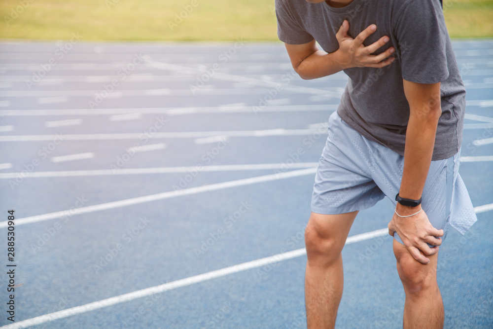 Man runner athlete chest injury and pain. Man suffering from painful chest or Symptoms of heart disease while running on the blue rubberized running track.