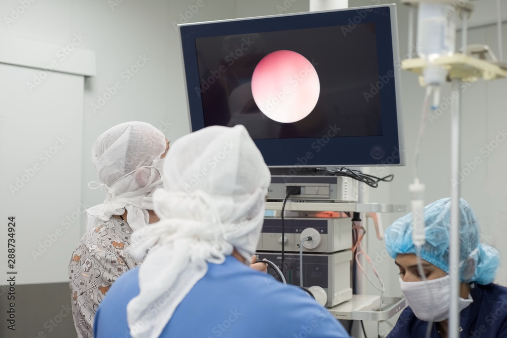 a team of doctors conduct an endoscopic examination of a child with a bladder disease. Cystoscopy.