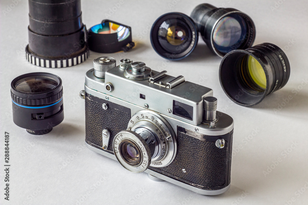 old vintage shabby camera on background of colored lenses on a white background with shadows