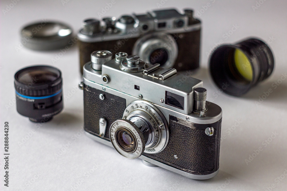 vintage shabby camera on blurred background of another camera and color lenses on a white background with shadows