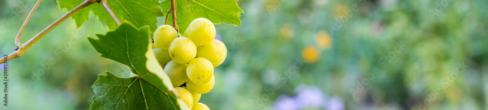 banner of Bunches of white grapes hanging in vineyard against at green and yellow background during sunset