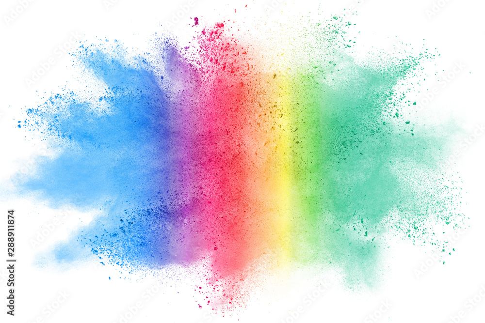 Freeze motion of colorful color powder exploding on white background. Paint Holi.