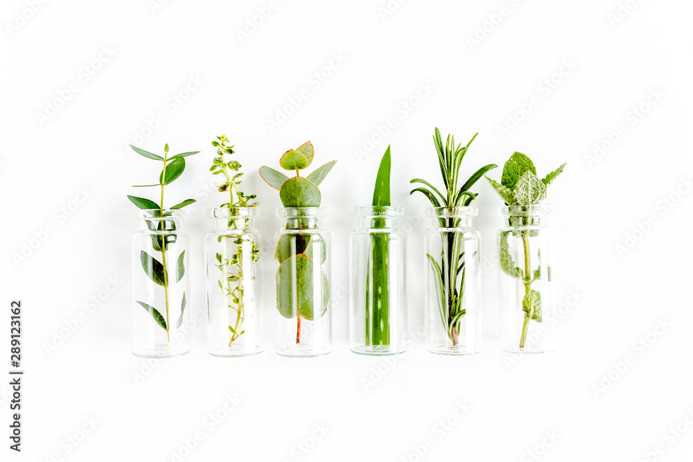 Mix of herbs, green branches, leaves mint, eucalyptus, rosemary, aloe Vera and plants collection on white background. Set of medicinal herbs. Flat lay. Top view.
