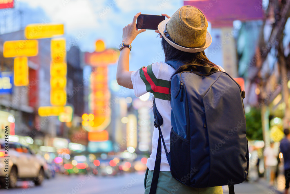 woman tourist taking action of shot photo in Chinatown of Bangkok, Yaowarat, famous and popular place place in Bangkok
