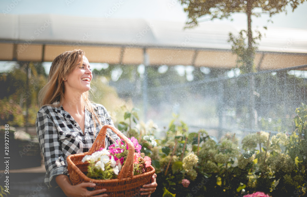 Smiling customer walking along path in garden center between rows of plants