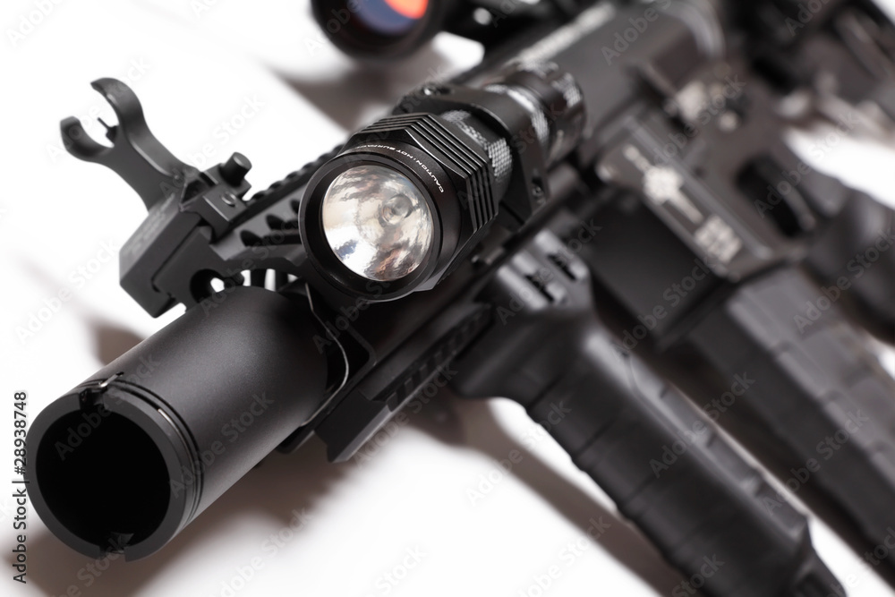 M4A1 carbine with tactical flashlight on white background