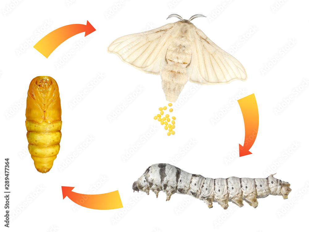 Silkmoth, Bombyx mori (Lepidoptera: Bombycidae). Life cycle. Isolated on a white background