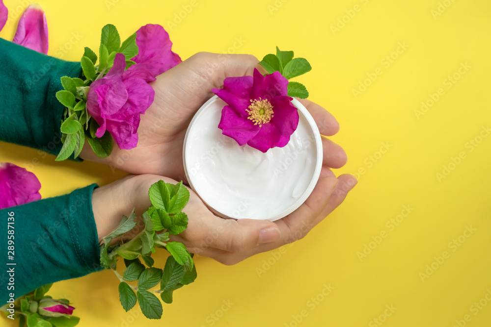 Young female hands are holding jar with white anti-ageing moisturizing cream with dog rose oil essential and vitamin E on bright yellow background with bright pink dog roses, petals and green leaves