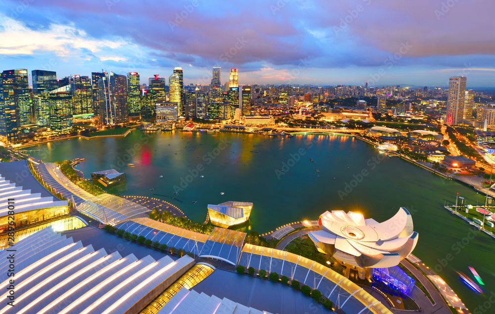 view of Singapore skyline view of skyscrapers on Marina Bay at sunset