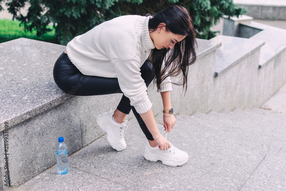 beautiful girl ties shoelaces sitting on the parapet in the park.