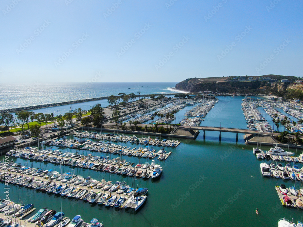 Aerial view of Dana Point Harbor and her marina with yacht and sailboat. southern Orange County, California. USA