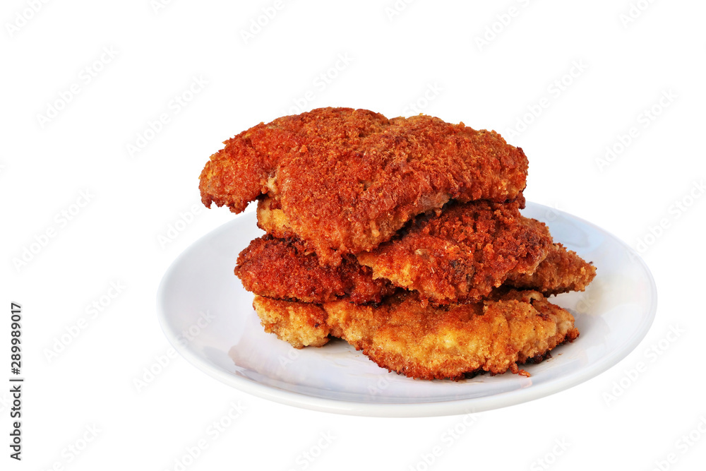 Stack of homemade breaded schnitzel on plate isolated on white background. Crispy breadcrumb coated fried meat.