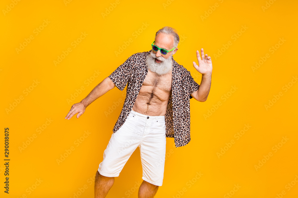Photo of cheerful still full of strength old man dancing like no one sees him wearing eyewear while isolated with yellow background