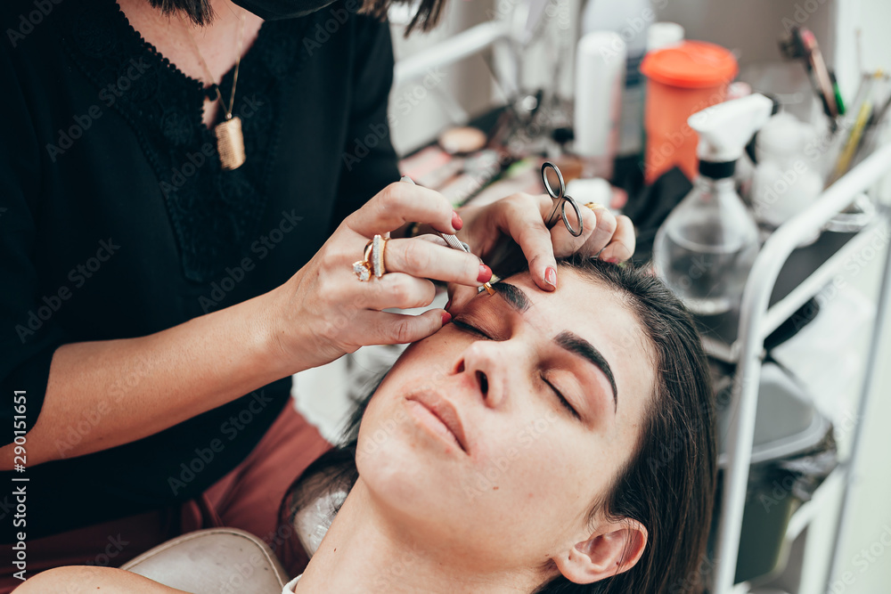 Attractive woman in beauty salon on facial hair removal threading procedure