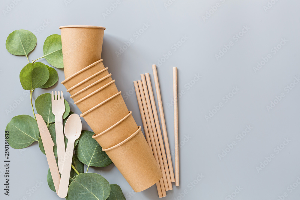 eco natural paper cups, straws, wooden cutlery flat lay on gray background. sustainable lifestyle concept. zero waste, plastic free items. stop plastic pollution. Top view, overhead, template, Mockup.