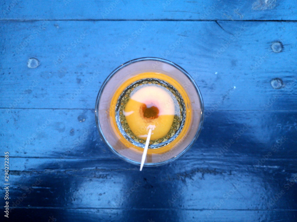 Mispelchen mit Aprikose in einem runden Glas auf blauem Holztisch im Sommer im Biergarten Zur Sonne in der Berger Straße im Stadtteil Bornheim in Frankfurt am Main in Hessen