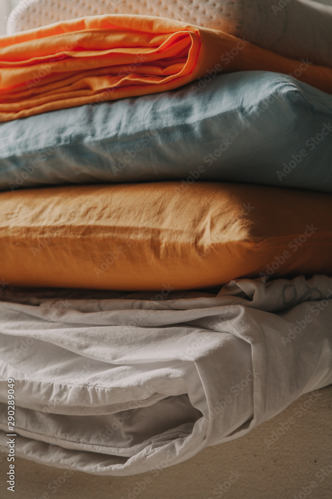 Stack of multi-colored bedding and pillows