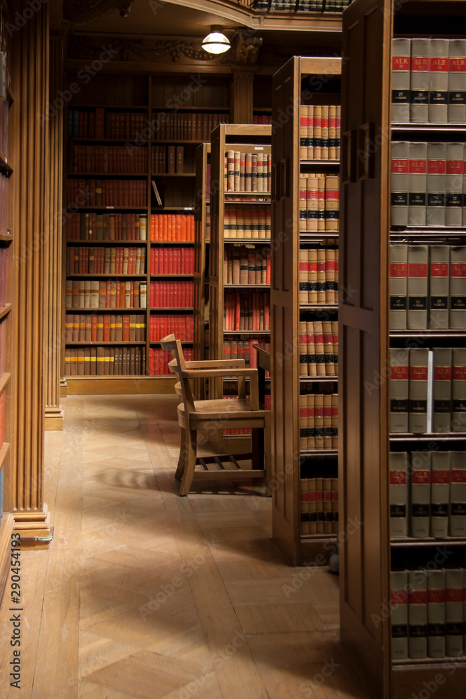 Wood style nice library with chair and full of book on shelf. Place for student to study and read.