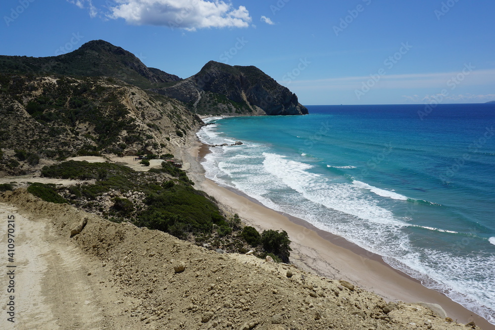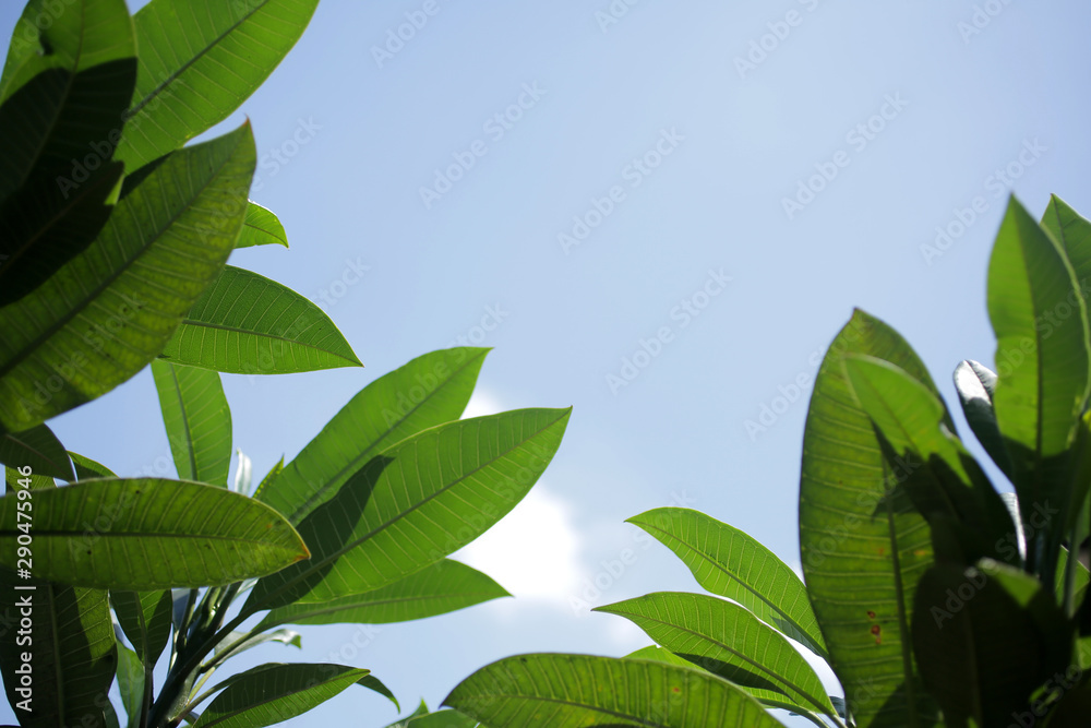 Frangipani tree top high view. Summer concept. Nature half frame with fresh green leaves and blue sky. Copy space for text or design. Nature leaves background.