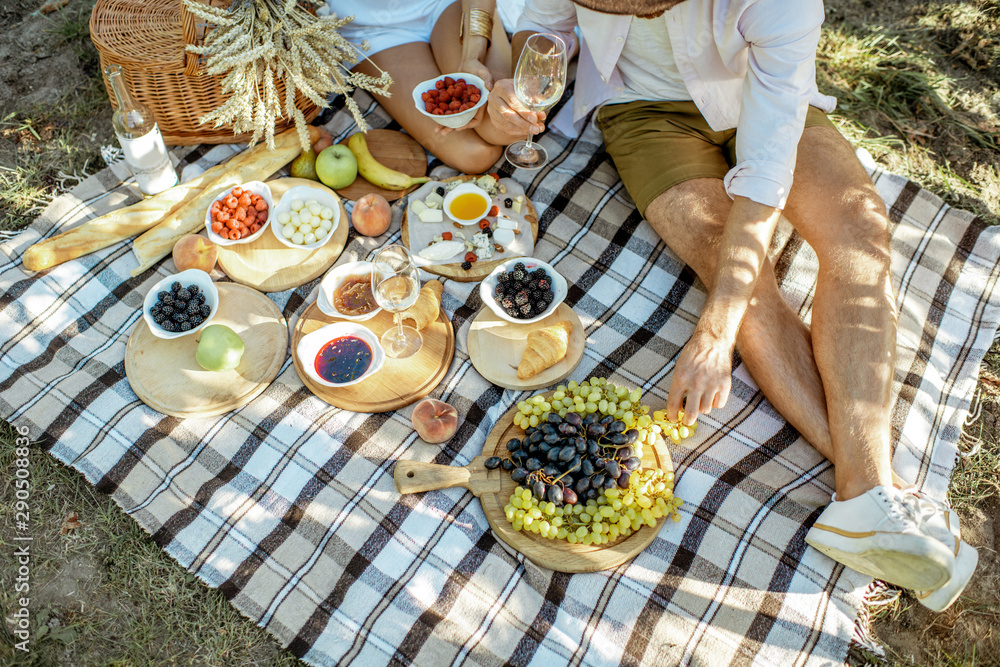 Couple having romantic breakfast outdoors, close-up view on the picnic blanket with lots of tasty food