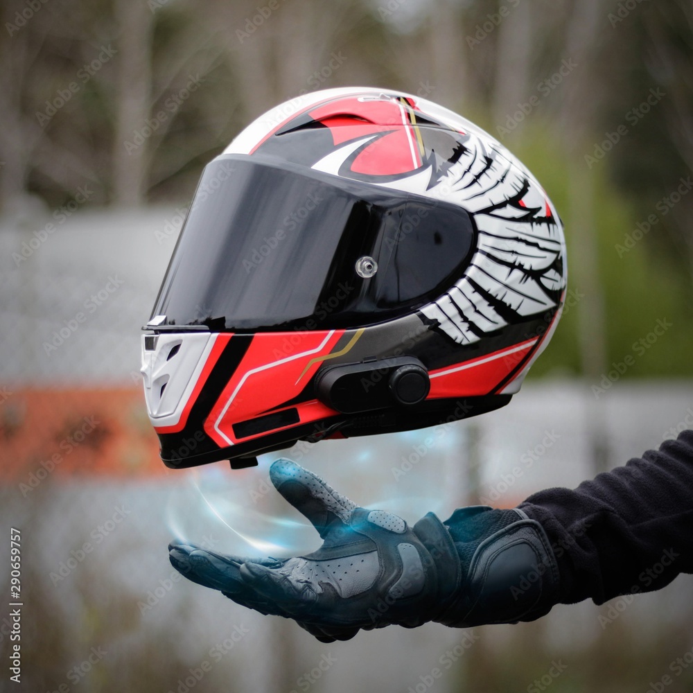 Hand magically holds a motorcycle sports helmet. Close up. Hand in a leather glove