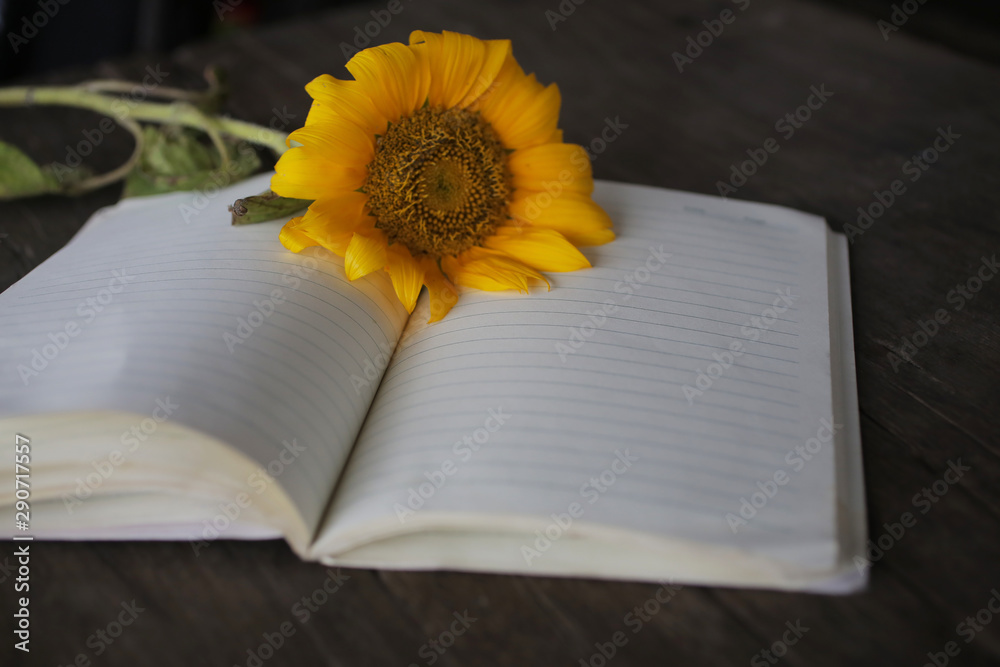 Notebook with flower and pen on wooden table. Blank page on open book page for copy space of text or design.