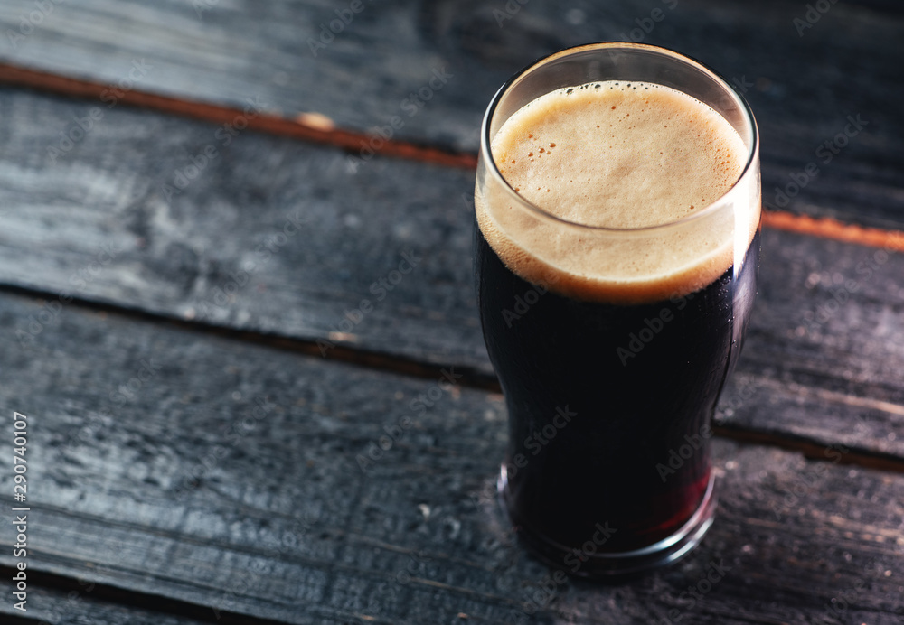 A glass of dark craft beer porter on a wooden table in a pub with copyspace
